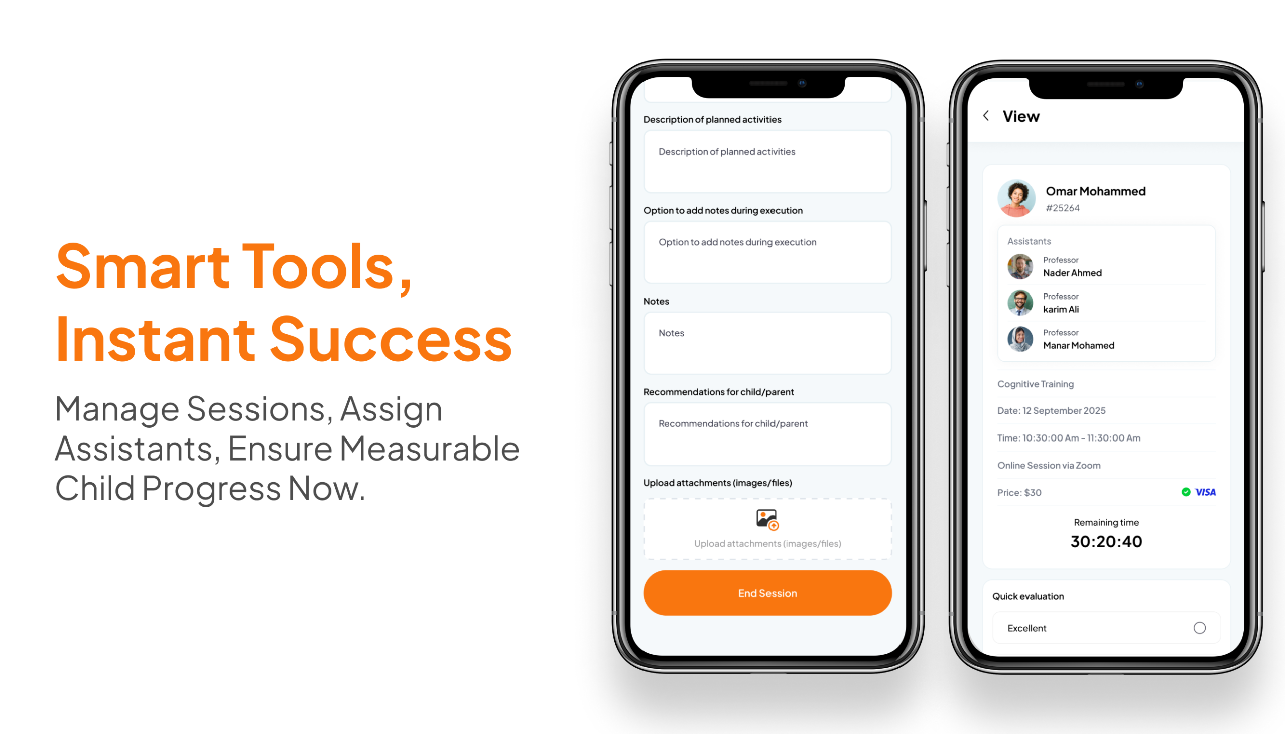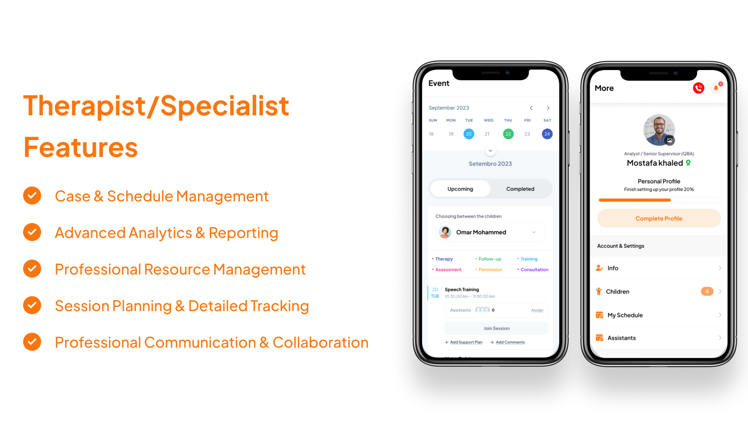 Provided an Integrated System for Case and Schedule Management: We created a smart platform allowing therapists to efficiently and easily manage client files (Cases) and organize their appointments and session schedules. Implemented Advanced Session Planning Tools: We developed a system supporting detailed planning for therapeutic sessions, including precise goal setting, tracking completion rates, and recording notes, which ensures the systematic execution of treatment programs. Integrated Specialized Behavioral Analytics and Statistical Reporting: We incorporated a robust reporting system that provides visual statistics (such as radar and bar charts) and includes a specialized tool for analyzing behaviors using the ABC model, offering a comprehensive assessment of the child's progress.